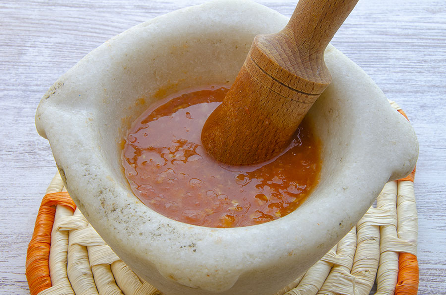 - Mientras el tomate se cuece, macha en un mortero un poco de sal, ajo y los cominos.