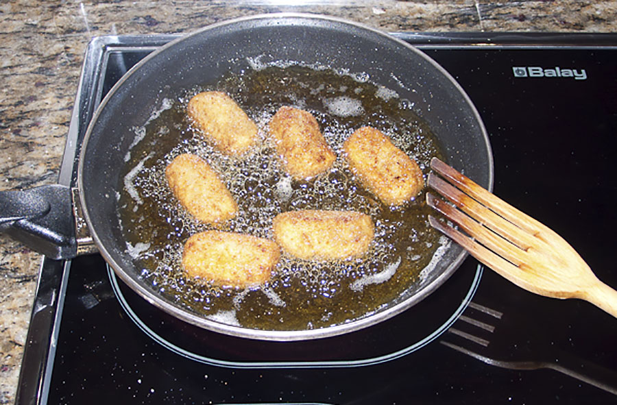 Sacaremos las croquetas del congelador, como una media hora antes de freírlas, y las dispondremos, fuera de la bolsa, sobre la encimera de la cocina. De esta manera las atemperamos y evitamos, por una parte, que nos salte el aceite al freírlas y por otra, que nos quede parte del interior de la croqueta fría o congelada, como ocurre en algunos bares.