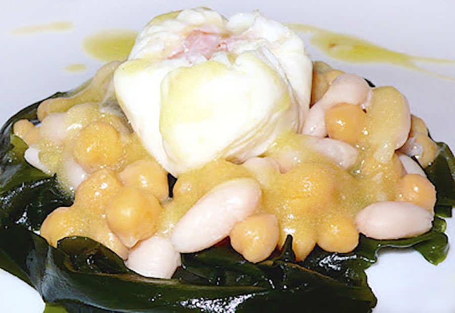 Con el pil-pil que había sobrado de otro plato, se me ocurrió preparar este guiño al clásico potaje de cuaresma. Entre otros, sustituiremos las espinacas por unas algas wakame.