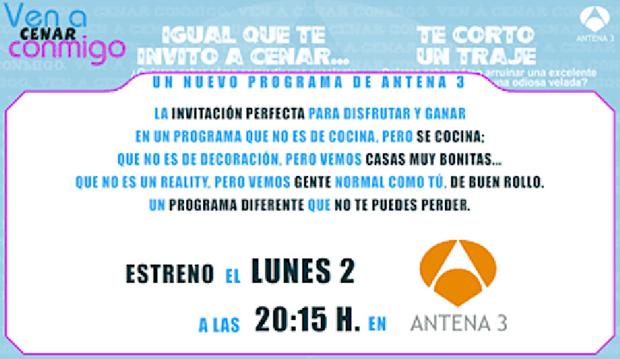 Este noche la cadena de TV Antena 3 emite a las 20:15 h. el primer programa de la adaptación española del programa británico Come Dine With Me. Cada día, uno de los cinco concursantes de cada semana, tiene que preparar una cena para los otros cuatro y demostrar que es el mejor anfitrión. Según Antena 3: