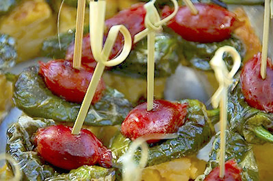 - Tortilla de patata, con huevos de campo, encima un pimiento verde frito tipo Padrón, de los que no pican, y por último un choricito tipo cocktail a la plancha.