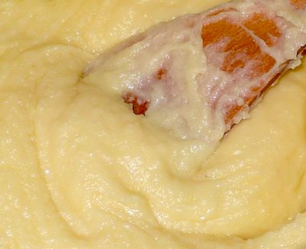- Añadir la leche muy caliente, en chorrito fino, y seguir mezclando hasta que la leche quede absorbida.