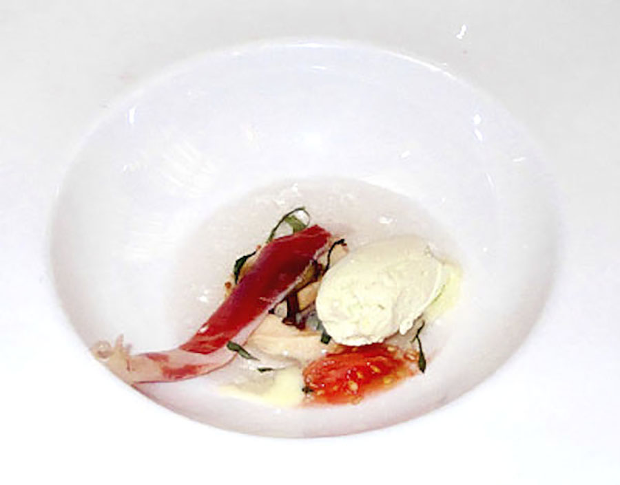 - Turrón de hígado de pato, con orejones escabechados, fresas y una reducción de vinagre de Módena.