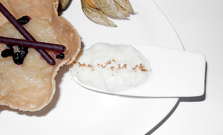 Ese día se habían elaborado otros postres, así que presenté el arroz en unas cucharillas degustación, adornadas con un hilito de canela.