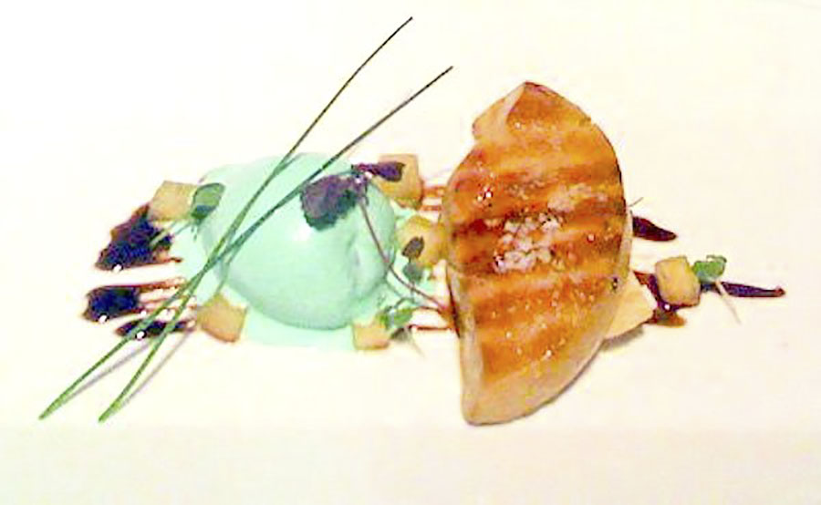 - Medallón de foie con manzana en diferentes texturas -helado, crujiente y trozos- y reducción de oloroso.