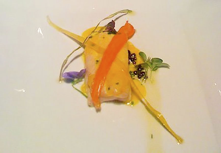 - Lenguado al vapor, con transparencias de verdura, caviar de tinta de calamar y salsa de naranja. En nuestra opinión, y ya se lo comentamos al chef, fue el punto débil del menú, ya que estaba demasiado hecho para nuestro gusto y resultaba seco para el paladar.