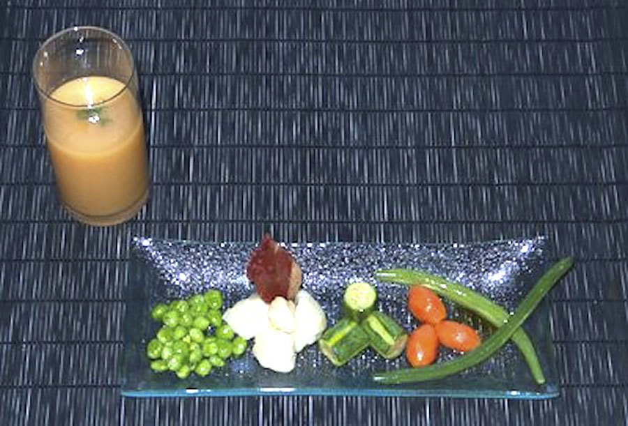 Una menestra de verduras en dos texturas, por un lado las verduras ligeramente cocidas y rehogadas en tocino fresco ibérico y por otra una crema ligera de verduras cocida con una punta de jamón.