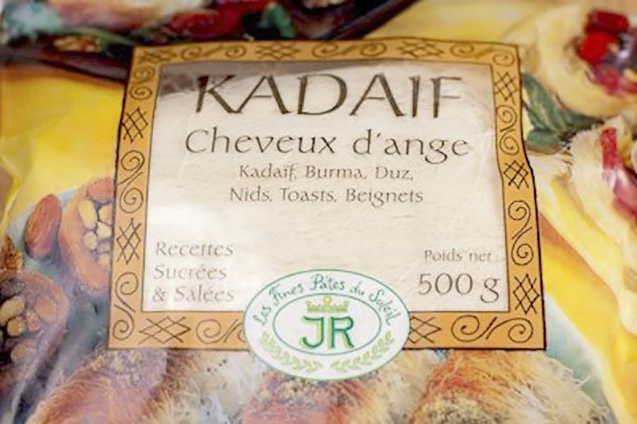 El otro producto fue la pasta kataifi, también conocida como kanafeh, kadaif, kadaifi, künefe… dependiendo del país. Es una especie de cabello de ángel elaborado mediante finísimas tiras de pasta phyllo. Según se cuenta es una pasta originaria de la ciudad de Nablus (Palestina) y que también se encuentra en la cocina de los Balcanes como Grecia, Turquía… Es una pasta muy utilizada en la cocina dulce, aunque también se utiliza en la salada por su vistosidad y el toque crujiente que aporta al plato.