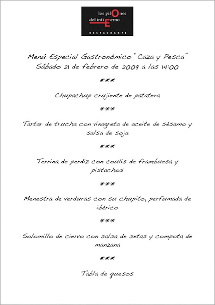El nombre ficticio del restaurante, elegido para el Trabajo Obligatorio del Módulo de Iniciación a la Cocina Profesional es “Los Pilones del Infierno” y la carta diseñada para el Menú Especial Gastronómico «Caza y Pesca» es la siguiente: