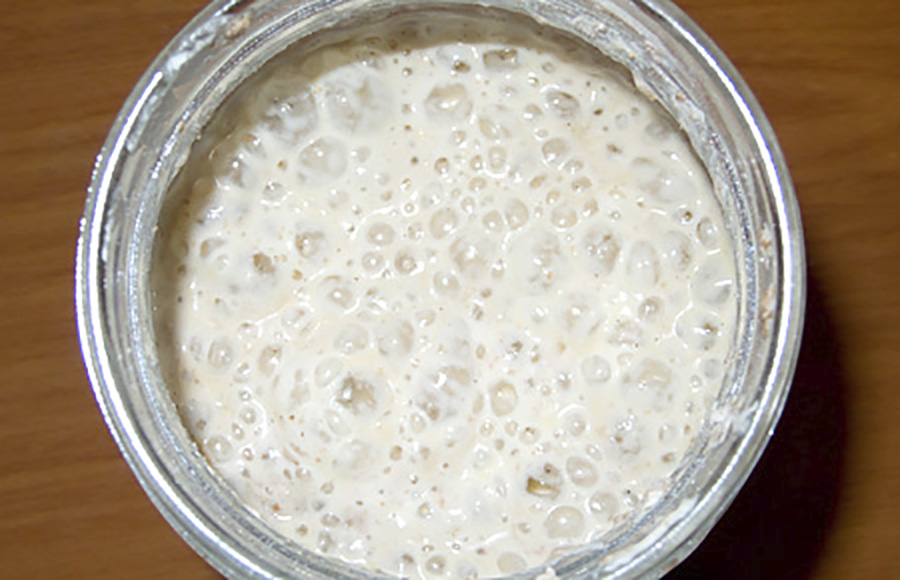 - Se empieza mezclando harina integral, de fuerza, agua, unas pocas pasas y un poco de yoghurt natural o zumo de limón para corregir el PH, creando un medio ácido. Debe de quedar como una papilla espesa.