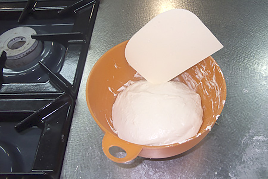 - 1ª Fermentación. Durante la primera fermentación (unas tres horas), estirar y plegar la masa una vez cada hora.