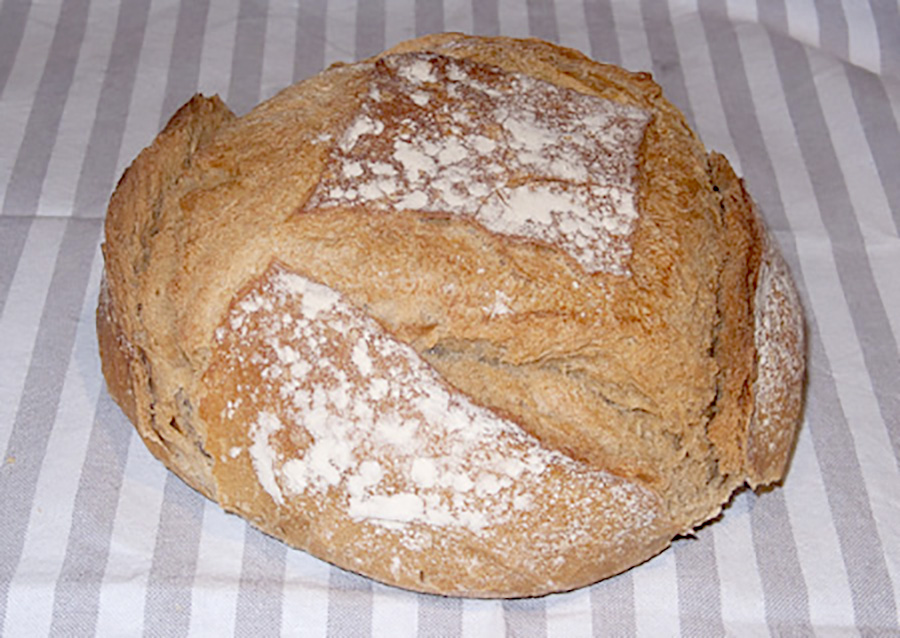 - Hornear, más fuerte al comienzo y más suave al final. Si el pan se tuesta mucho, se puede bajar la temperatura por debajo de 200 ºC y cubrirlo con papel de aluminio. Hornear unos 45-50 minutos. Se saca cuando suena a hueco al golpear la base.