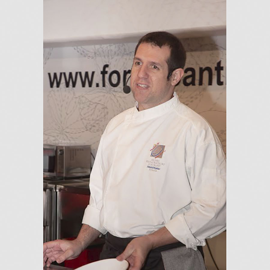 Andrés Conde -antiguo jefe de partida de elBulli– montó un sofisticado postre a base de salsa de chocolate, bizcocho de almendra y azahar, caramelo relleno de praliné de nuez, trozos de manzana osmotizada en moscatel y albahaca, crujiente de almendras y miel, helado de leche de oveja… Entre el público se encontraba Miki Álvarez (compañero de elBulli) y fue el encargado de hacer la cata.