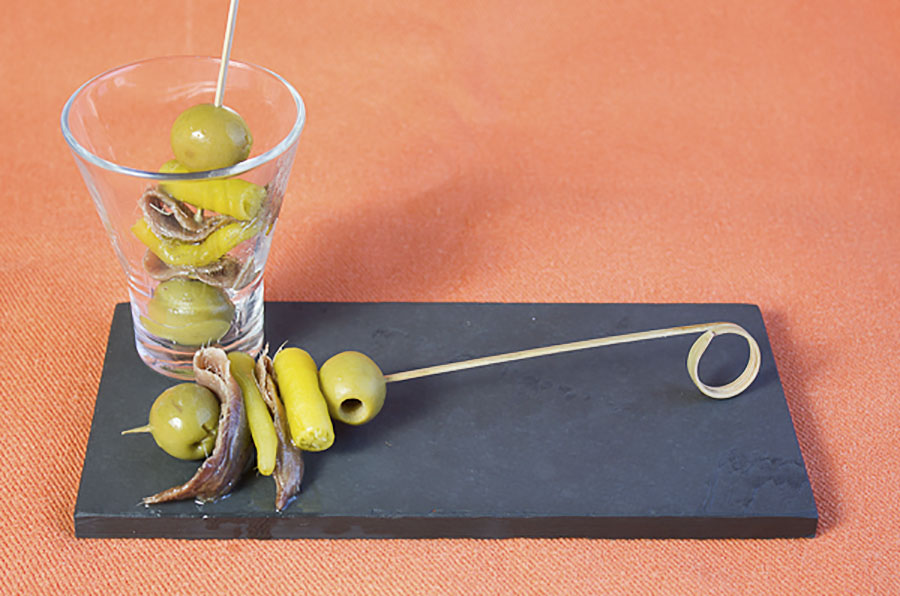 Empezamos con unas gildas, uno de mis pinchos favoritos. Algo tan sencillo y tan rico como unas aceitunas de manzanilla sin hueso, unas buenas anchoas del Cantábrico, unas guindillas, un chorrito de aceite de oliva virgen extra y un ligero toque de sal. En casa no suelen faltar unas Ibarrako Piparrak (guindillas de Ibarra).
