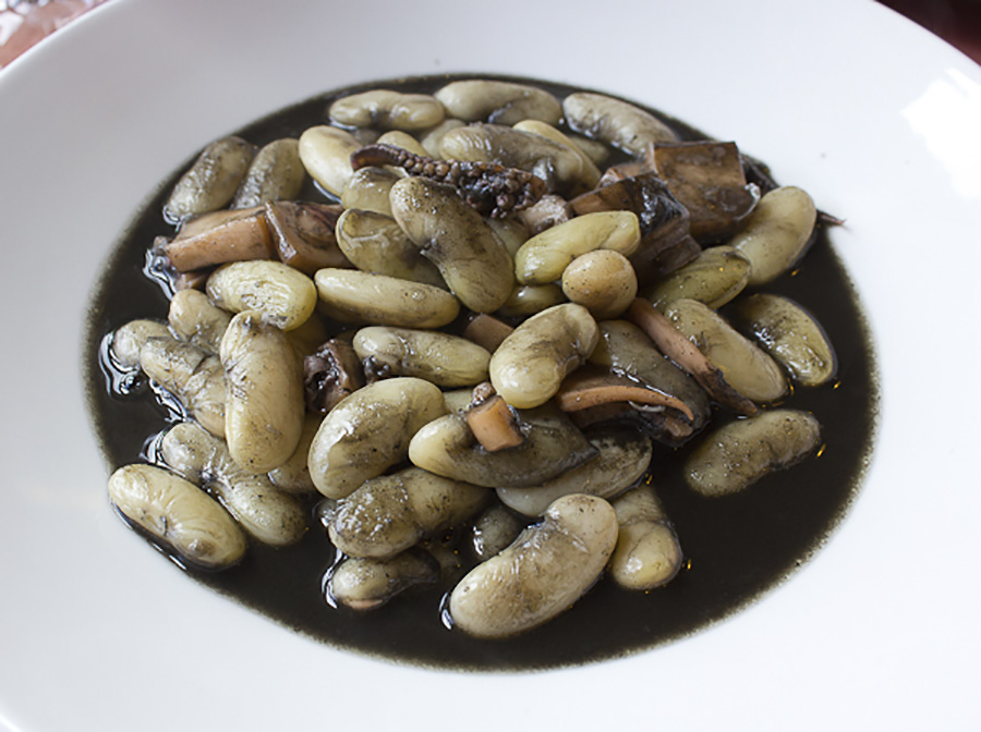 - Unas deliciosas fabes frescas con calamares en su tinta que me recordaron a mi receta de fabes frescas con patas de calamar en su tinta que preparé hace más de dos años. Pusieron una fuente, como manda la tradición, para que se pudiera repetir.