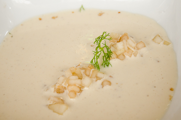 A la hora de comer estuvimos en el Restaurante La Sarga de Cazorla, pero antes de la comida su propietario y cocinero José Lorente nos explicó, en las instalaciones que tienen habilitadas para eventos, como se realizaba el ajoblanco de piñones con una emulsión de AOVE de la variedad Royal, uno de los platos que posteriormente degustamos, junto a una brunoise de pera, sémola de piñón y brotes tiernos de hinojo. En este vídeo que he montado se puede ver como se prepara.