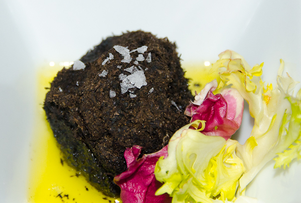 - Trufa negra de paté de perdiz, con crema de higos, rúcula y aceite de oliva virgen extra variedad royal