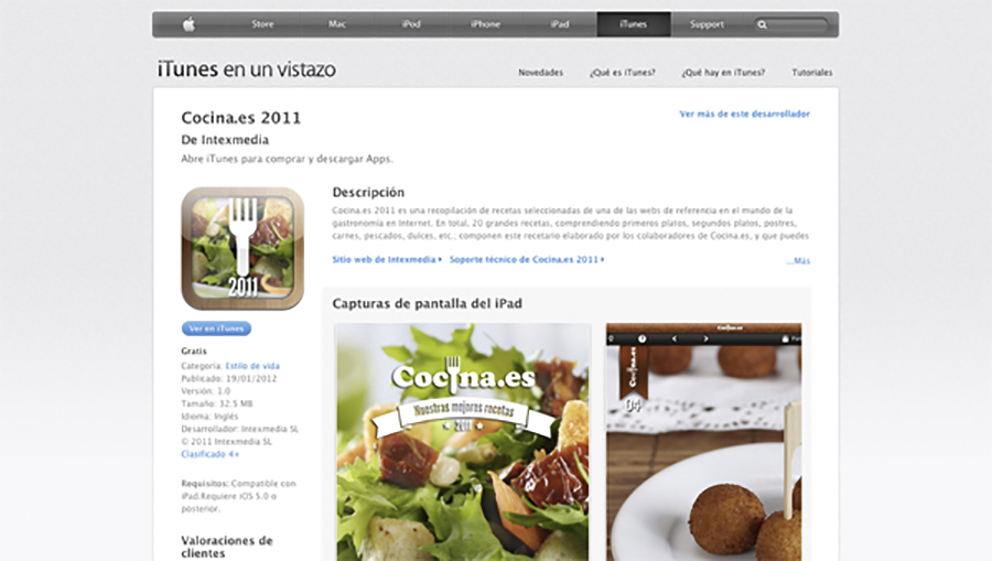 Sabía que Intexmedia estaba desarrollando una aplicación gratuita para iPad con algunas de las recetas de los colaboradores de Cocina.es. Me pidieron hace tiempo la foto de una receta, que no tenía la suficiente resolución y ya me había olvidado del tema, hasta que el otro día recibí un e-mail avisándome de que ya estaba lista en iTunes.