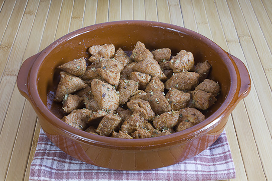 - Trocear el magro en tacos de unos 2 cm aproximadamente. Reservar en un bol.