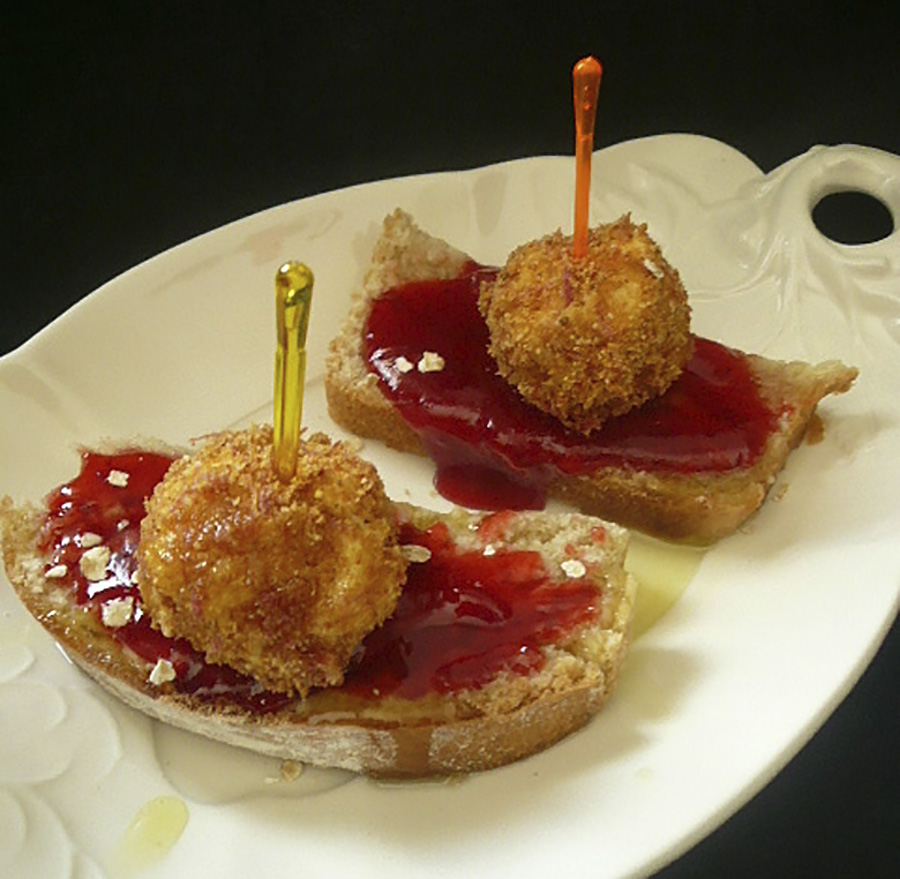 - Una tostada de pan de avena de avena, con una cucharada de mermelada casera de frambuesa (tambien vale y lo aseguro riquísima de higos o de cebolla y manzana confitada) y la bolita de quesos con jamón.
