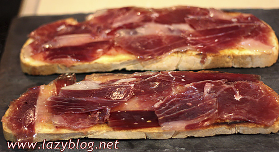 Para este I Certamen Gastronómico, Pakus, del blog Lazy Blog, nos deleita con una elaboración del Bar jamón ubicado en el Puerto de Santa María (Cádiz). Sobre una rebanada de pan tostado de telera o candeal, se unta ajo, se le incorpora el tomate rallado, un buen aceite de oliva virgen extra y las lascas de un jamón ibérico de bellota, de esos que se saltan las lágrimas.