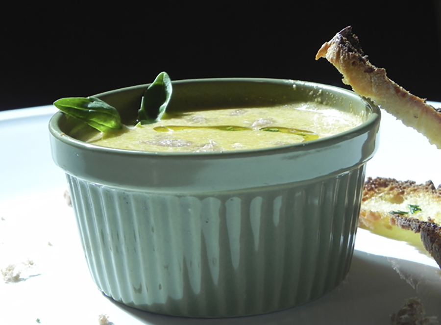 Mónica del blog Monitouille – mi mundo de cocina nos propone este refrescante gazpacho de melón, aderezado con una sal de jamón y un chorrito de AOVE con perejil. Se acompaña con unas rodajas finas de pan crujiente untado con ajo y con un poco de AOVE.