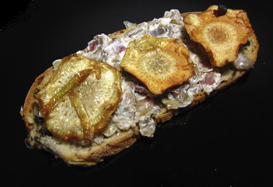 Cómo elaborar una receta de “Tosta de pan de aceitunas con jamón ibérico, setas, mascarpone y chips crujientes de alcachofa”