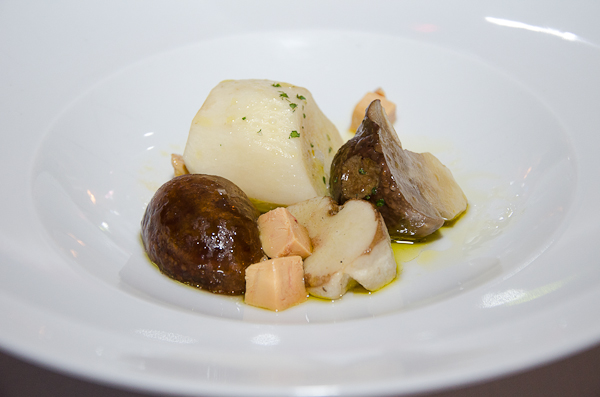 Continuamos con unos hongos confitados con foie, unos tiernos puerros hervidos con huevo de caserío escalfado, una pequeña ración de las famosas y cremosas Alubias de Tolosa, sin sus sacramentos, que sirvieron de hilo conductor para explicarnos que características se valoran en este plato elaborado simplemente con agua, aceite y sal ¿para qué más?