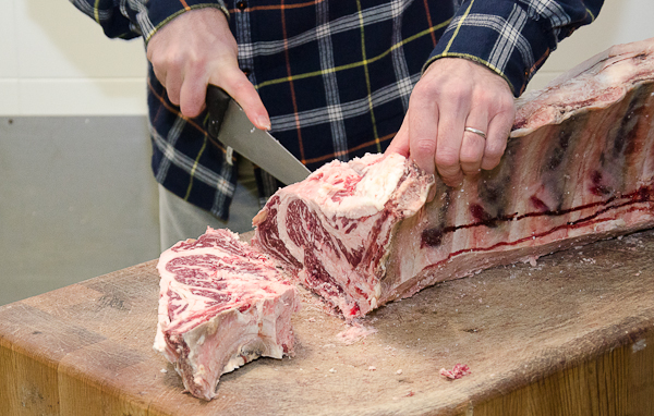 Ya por la noche fuimos a visitar Cárnicas Goya, donde Josean (José Antonio Goya) nos enseñó las instalaciones y cámaras donde las carnes maduran a una temperatura de 1º C y 70% de humedad aproximadamente. Nos dio una clase sobre la carne y al final seleccionó un lomo alto de vaca del que sacó varios chuletones de unos 7 cm de grosor aproximadamente, que nos llevaríamos a Casa Julián para que el experto parrillero Matías Gorrotxategi los preparase. En este asador, con un ambiente muy peculiar, que fue denominado como la Capilla Sixtina del chuletón por Rafael García Santos, acompañamos los chuletones de cogollos de Tudela, espárragos en vinagreta y pimientos del Piquillo confitados.