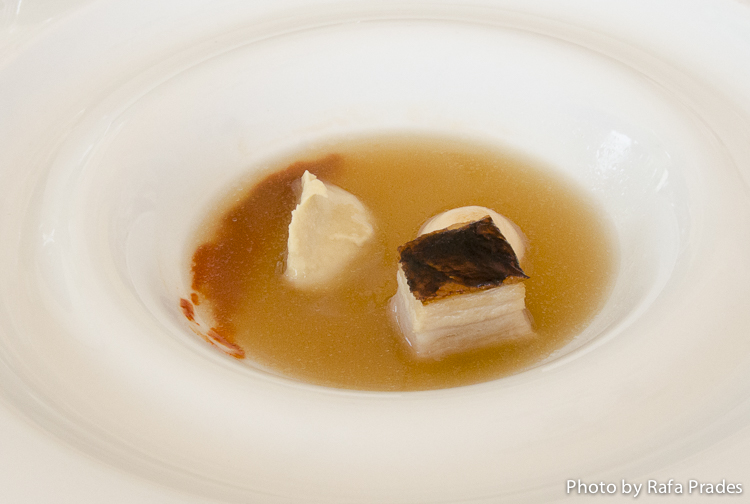 Caldo de garbanzos, brochazo alegre (picante), hummus, panceta asada y ajo negro.