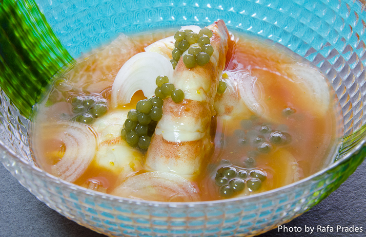 La idea de este plato, que deja sensación de mar en el paladar, es concentrar sabores del Golfo de Cádiz y en general del Océano Atlántico. El producto principal es el reconocido langostino de Sanlúcar de Barrameda (Cádiz) con el que haremos un ceviche en un clásico cocktail “Bloody Mary” en el que sustituiremos el vodka por vino blanco seco Castillo de San Diego de Bodegas Barbadillo y le añadiremos un toque oriental con ralladura de Yuzu. El toque picante del ceviche lo aportará la salsa del Bloody Mary. Para potenciar el sabor marino utilizaremos plancton, perlas de alga wakame del Atlántico y sal de las salinas de San Vicente (San Fernando, Cádiz).