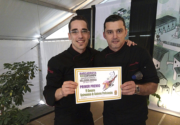 Con esta sabrosa receta de Bombón de solomillo ibérico relleno de trigueros y boletus sobre tartar de criadillas, tomate curado y carabineros. los cocineros Miguel Ángel Sánchez y José Antonio Rey del Restaurante Eustaquio Blanco de Cáceres ganaban el primer premio del VI Concurso Gastronómico de Cocineros Profesionales dentro del, ya consolidado, Certamen Gastronómico del Cerdo Ibérico celebrado a finales de abril en la localidad pacense de Barcarrota. Un certamen que ya va por la XII edición y cuyo precursor es el afamado cocinero Javier García chef del Restaurante Lugaris (Badajoz).