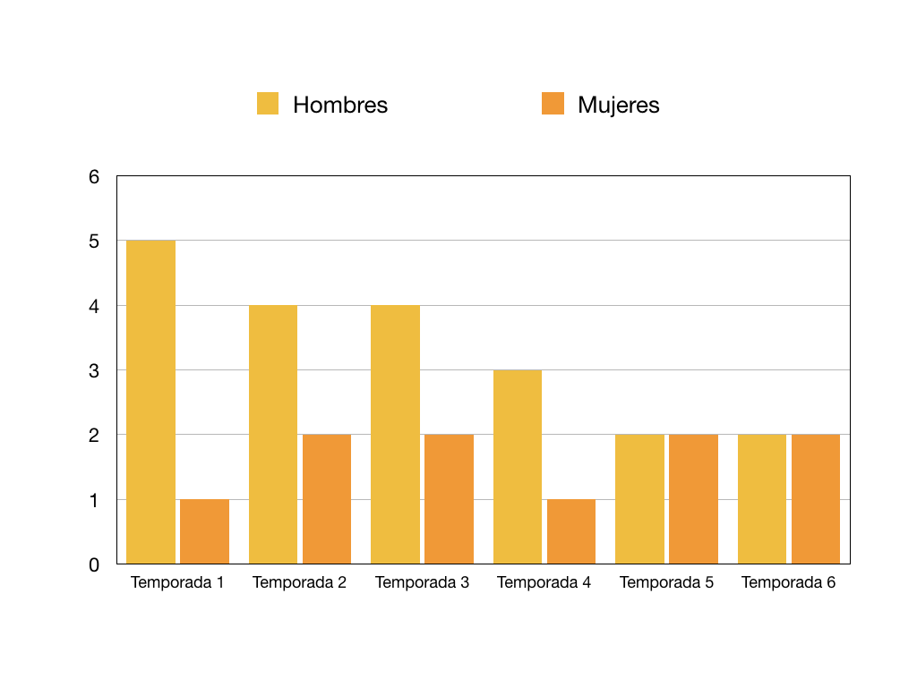 La distribución por género se muestra en la gráfica siguiente. En las temporadas 5 y 6 se han igualado el número de chefs mujeres con el de hombres.