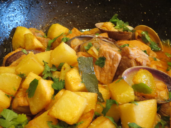 - Retirar la manteca de cerdo sobrante, añadir el vino blanco y el líquido de las almejas que teníamos reservado. Cocinar unos minutos, añadir las almejas, un poco de cilantro, cocinar un poco más para que los sabores se integren.