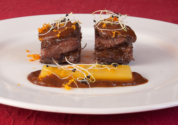 - Con un rallador fino, tipo microplane, rallar un poco de cáscara de naranja por encima de los trozos de carrillera. Terminar con unos germinados. Servir caliente.