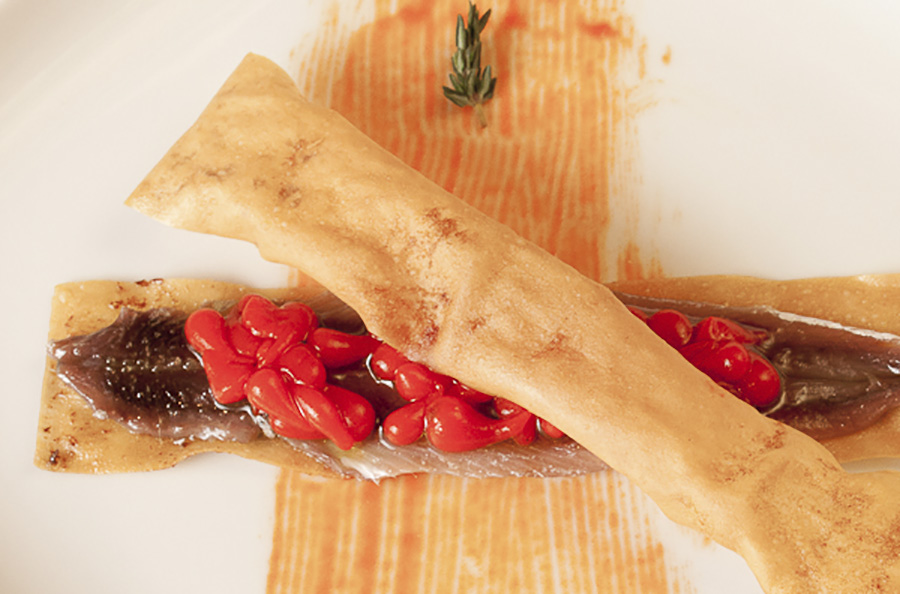En este plato, se juega con los recuerdos que nos evoca un tradicional bocadillo de anchoas con pimientos. Lo que se presenta es algo muy diferente: el pan de miga se ha sustituido por dos láminas crujientes de pasta filo, el pimiento en tiras por una esferificación de un jugo triturado y colado de pimientos del piquilllo y la anchoa se mantiene en toda su tradición, una anchoa que se ha elaborado artesanalmente durante meses en una salmuera. En definitiva es un plato que combina la tradición y la tecnología en investigación culinaria a base de alginatos y calcio.
