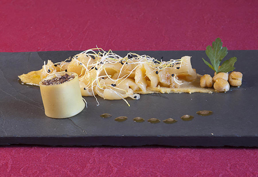 Acompañando a estos callos irá una versión de humus, un puré de garbanzos muy sabroso y humilde de la cocina de Oriente Medio y una falsa morcilla de arroz, que elaboraremos con una tradicional morcilla fresca extremeña de Arroyo de la Luz mezclada con quinoa, en lugar de arroz, un pseudocereal que ya se cultivaba hace unos 5.000 años en los Andes y era uno de los principales alimentos de los pueblos andinos, preincaicos e incaicos. Como soporte de este acompañamiento que podríamos denominar falso tuétano utilizaremos pasta paccheri.
