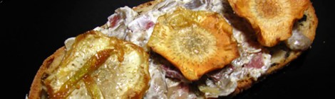Cómo elaborar una deliciosa receta de “Tosta de pan de aceitunas con jamón ibérico, setas, mascarpone y chips crujientes de alcachofa”. Esta receta fue presentada al I Certamen Gastronómico Paraíso de Sabores.